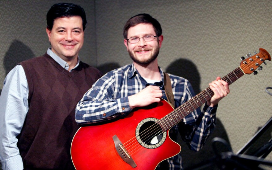 Ray Hardman, left, and Joel Weik with one of his Ovation guitars during a visit to WNPR.