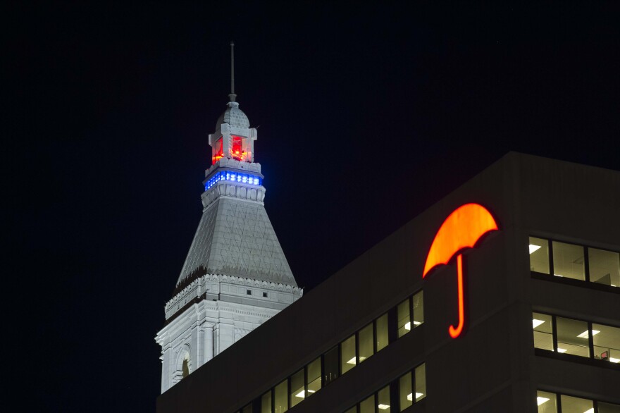 The lights of the Travelers Tower on Grove Street flashed blue, white and red as a mark of respect, after last Friday's terror attacks which claimed the lives of 129 people.
