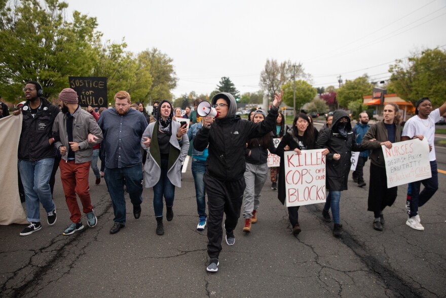 "For all the white neighbors out here who are wondering why we're disrupting the peace in your neighborhoods, the peace is being disrupted in our black and brown communities by the officers we pay out tax dollars to," Ellington said through the bullhorn.
