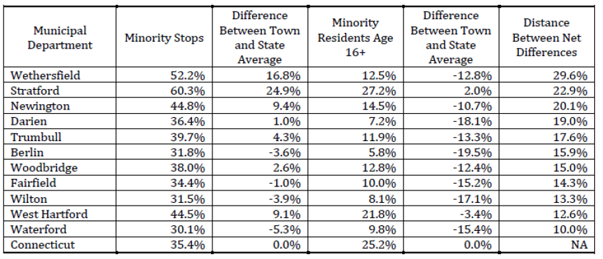 The report also found that Darien, Manchester, Meriden, Newington, Norwich, Stratford, Waterbury and Wethersfield exceeded the disparity threshold with multiple census-based benchmarks. The three benchmarks are statewide average, the estimated commuter driving population, and resident-only stops.